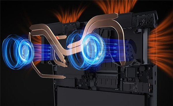 Y9000P 2022升级霜刃Pro散热系统4.0,涡轮增压双风扇,搭配2x10mm+1x8mm+2x6mm总计5根热管,多区进风,四出风口。