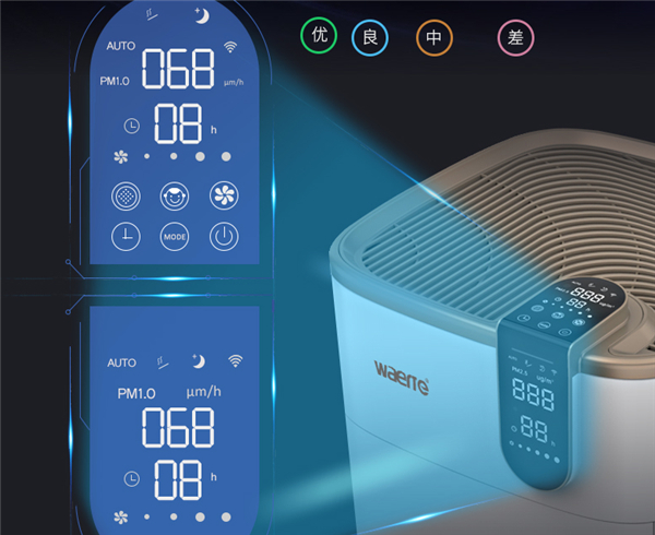 双面液晶屏搭载四色LED灯,无需近距离查看就能知道室内空气质量。亮红色时代表空气质量差,亮黄色时代表空气质量一般,亮蓝色时代表空气质量优,亮绿色时代表空气质量优,通过颜色观察室内空气质量一目了然。此外,WIFI功能也十分实用,上班族在公司远程操作,提前开启这款除甲醛空气净化器,回家就能享受健康空气,健康又安全。