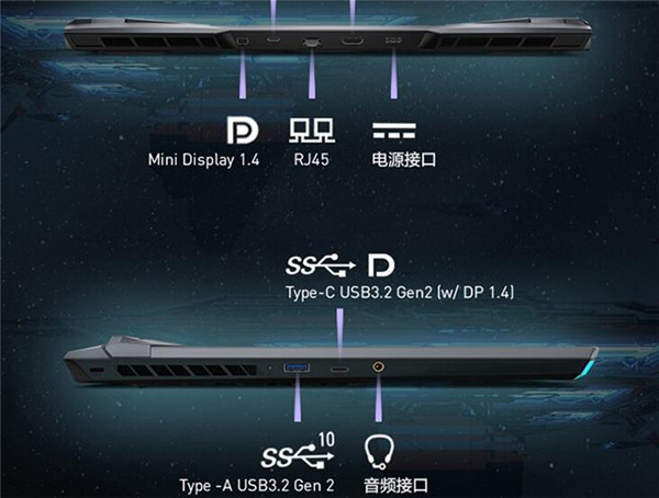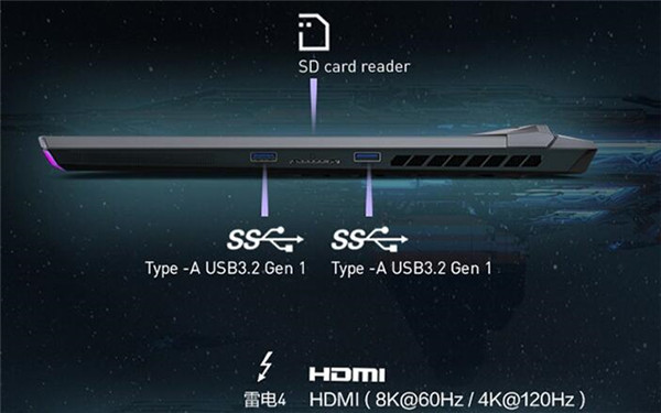 微星强袭GE76配置齐全。机身左侧配置USB3.2 Gen2、Type-C(USB 3.2 Gen 2)、3.5mm音频口,机身右侧有2×USB 3.2 Gen1和SD卡槽,机身后侧有miniDP 1.4、Thunderbolt 4、RJ-45以太网口、HDMI 2.0以及电源接口。