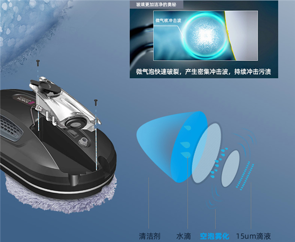 湿擦过程中,玻妞388的超声波喷嘴可以喷出15μm微小水珠,溶解玻璃表面细小灰尘,擦两下,喷一下水雾,细腻的水雾能清除掉顽固污垢的同时做到精确的覆盖所有清理范围,这样科学的设计能把玻璃擦的更干净。
