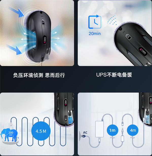 玻妞388擦窗机器人内置AI智能系统,可以根据窗户大小自动规划路径,更智能化。采用日本进口无刷电机,真空马达吸力达5公斤,稳定吸附并轻松擦除粉尘细灰,强力清洁户外及较脏污玻璃。这款不仅可以擦玻璃,桌面、高楼层外窗、窗户、玻璃门,并且支持无框和多层玻璃擦拭。
