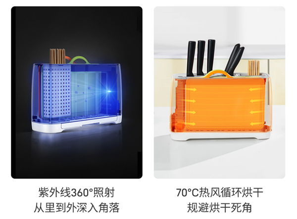 这款产品的杀菌消毒原理是采用UVC紫外线杀菌,紫外线光隐藏在内部,不会照射到皮肤上,真正做到360°全方位安全有效杀菌,杀菌率达99%; 采用安全的PTC均匀加热,70℃热风循环烘干,在杀菌的同时,破坏细菌、霉菌适合的滋生环境,烘干后的刀筷砧板也不会残留水渍。