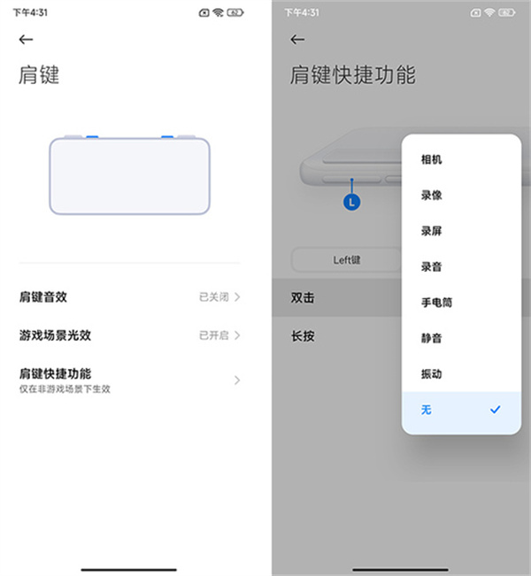 肩键可以设置相应的音效、光效和功能,功能上日常非游戏场景可以通过双击与长按触发,大家可以在设置里选择自己的高频使用场景。游戏场景下新增了分段触发功能,即按下、抬起分别对应不同操作,如按下开镜抬起开枪,使操作更迅捷。
