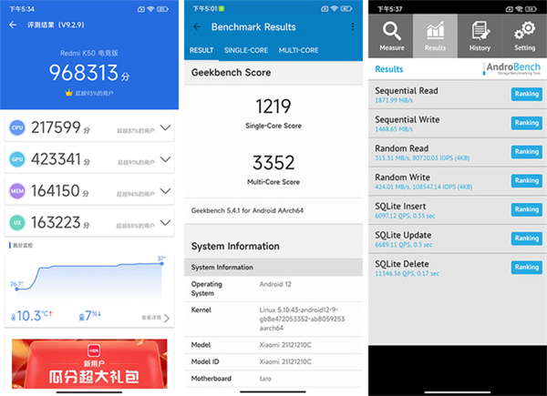 而且还搭载满血版LPDDR5内存以及升级版UFS3.1高速闪存,实测顺序读写分别能达到1871MB/s和1468MB/s,真的非常快了。同时还搭载最新小米自研的IO Turbo 2.0技术,解压缩性能提高100%。处理器方面,安兔兔跑分96万+,单核成绩1219,多核3352,大家看一下就行,K50电竞版在核心硬件这块基本给拉满了。