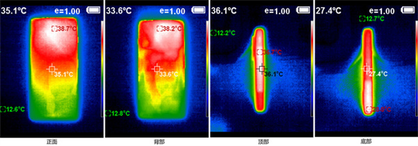 数据上,正面最高温达到38.7℃,背部38.2℃,均集中在手机上半区域,顶部为38℃,由于是金属材质且手掌完全接触,所以游戏中会感觉到升温比较明显,底部则在28℃,所以K50电竞版的主要发热源主要集中在手机上半区域,且接近顶部位置,大家玩游戏时需要注意一下。