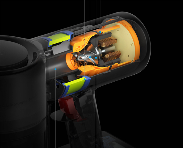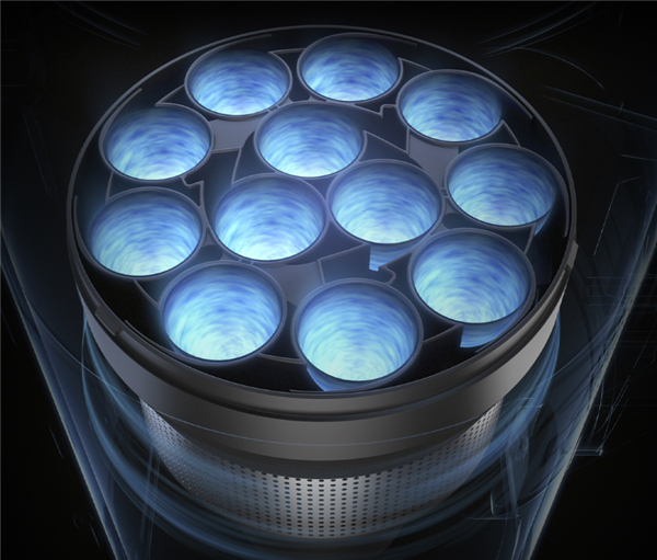 多锥旋风离尘系统发源于国外吸尘器品牌,近几年也被国产品牌发扬光大。在工作时利用气动离心力将主机内部微小的灰尘进行分离,减少HEPA过滤棉的压力。原理似乎很简单,但这种技术并不是很轻易就能模仿的到,设计优秀的分离系统在吸尘器使用很长一段时间后,HEPA过滤棉依然洁净如新,也能从侧面印证机器向外排放的空气十分清新干净。