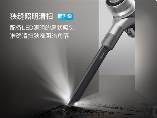 此外V12还附带了两个较小的软毛刷头,可以应对狭小缝隙的清洁工作,平时不使用时也可以通过充电底座实现收纳。追觅V12标配的窄缝吸头自带照明功能,在吸头的前部设计了LED灯管,当吸尘器处于工作状态时灯管就会亮起,原本比较昏暗的犄角旮旯瞬间就被照的清清楚楚,让灰尘无处躲藏。