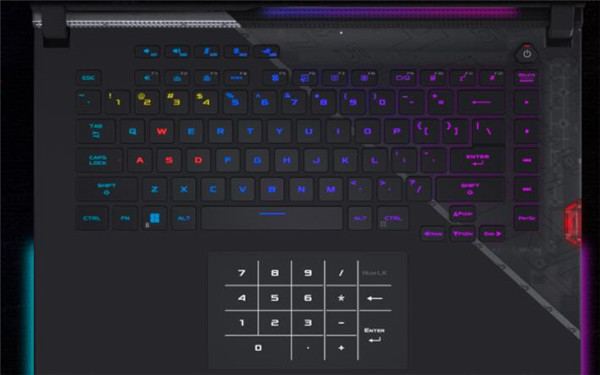 单键RGB影刃键盘,台式布局键盘,标准尺寸键距,快捷键单独分区,方便好用,主宰战场,全凭手中操控游刃有余。单键RGB支持AURA SYNC,2.0mm舒适键程,Overstroke闪击技术快速响应, 快捷键单独分区,简洁快速,触控板&数字键盘一键切换。