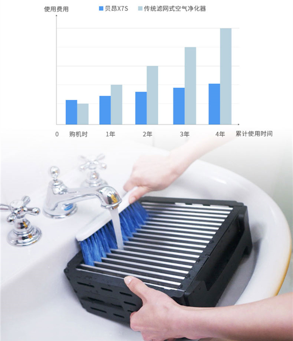 滤网作为净化器的耗材,需要定期的进行更换,而更换一套滤网的价格,少则几百,多则上千。这款贝昂空气净化器X7S的“杀手锏”就是它的无耗材设计,滤网可水洗保证了净化器的可持续利用。因为一般的家居空气环境没有那么恶劣,所以拿出收集极后可以先不着急放入水中,先用毛刷对一些浮尘或者表面的污物进行掸拂。如果需要水洗,把收集极放入容器内或者直接放在水龙头下,可以擦点中性洗洁剂,进行反复刷洗,直到干净变亮。