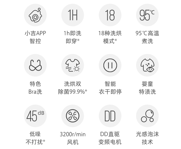 它配置J-Smart7维感知系统(衣量感知、水位感知、温度感知等),全面智能提高衣物烘干能力,1h烘干即洗即穿(烘干功率:1000W),而且是智能衣干即停。这对经常尿裤子的宝宝很友好。