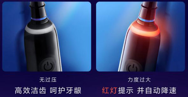 它采用小圆头刷毛,包裹式多角度清洁每一颗牙齿,可高效去除99.8%的牙菌斑。同时还有360度控压护龈灯,当力度过大时会有红灯提示并自动降速,可避免刷牙力度过大造成的牙龈损伤,非常贴心。另外前后40000次/分钟震动和左右8800次/分钟摆动的动力加持,以及轻柔清洁、专业清洁、美白抛光、护龈按摩四大功能模式一键自由切换,专业洁齿效果受用户一致称赞。