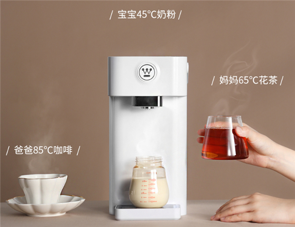 25℃基本就是水箱的常温了,45℃就适合冲泡奶粉,奶瓶都有刻度,设置好水温水量就可以自动冲泡了。60℃是冲泡蜂蜜的适宜温度,70℃适宜冲泡柠檬,85℃是咖啡的适宜水温,98℃沸水泡茶,3秒就能出热水,正好满足不同人群的饮用需求。