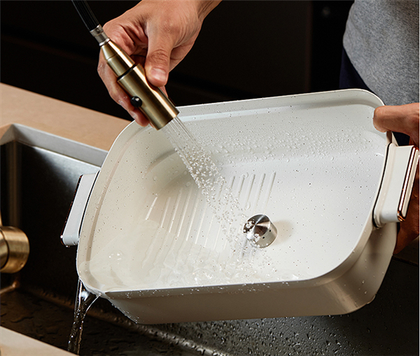 清洗就更简单了,主要需要清洗的部件全部都是非常容易清洁的陶瓷釉和不锈钢材质的,陶瓷釉的两个锅子,直接冲水就可以了,不锈钢的蒸格抹一点洗洁精,冲水就干净了,太适合懒癌人群了。
