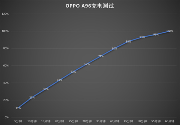 而在充电方面,OPPO A96采用了33W超级闪充,经过我们实测,仅需25分钟就能将手机充至50%以上,一个短暂的充电时间就能让手机摆脱没电的窘境,而在60分钟时,OPPO A96充至100%,一小时快速补能,对于这一价位的产品来说还是非常具有竞争力的。