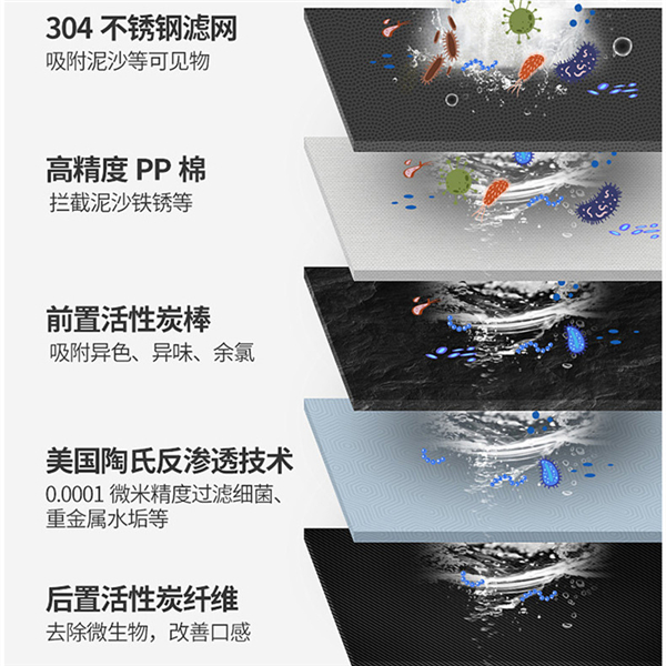 五重精度过滤,304不锈钢滤网—高精度PP棉—前置活性炭棒—美国陶氏反渗透技术—后置活性炭纤维,层层精滤。