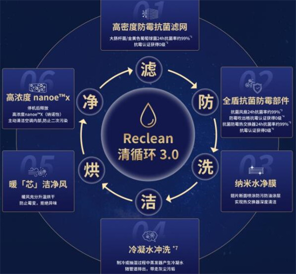 搭载ReClean清循环系统3.0,通过滤、防、洗、洁、烘净六个环节,打造全方位清洁的空调内部环境,保障输送清新空气,没有酸臭异味。