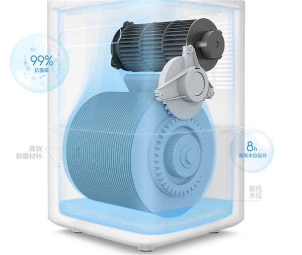 4L 容量的大水箱配合这套智米蒸发系统,加湿量可达260ml/h(毫升/小时),相比第1代多了20ml/h。水箱和蒸发盘部件采用了高效抑菌材料,可以有效抑制大肠杆菌、金黄色葡萄球菌等细菌滋生,抗菌率高达99%。