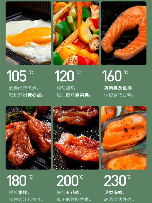 而在温度调控方面一共设有六个恒温档位,即105℃低档细致烹煮,轻松煎出溏心蛋;120℃均匀加热,轻油煎烤素菜类;160℃禽肉类及鱼排,保留食物香味;180℃慢煎羊排,锁住肉汁和营养;200℃快煎烤五花肉,真正的外酥里嫩;230℃可煎烤贝类海鲜,高温穿透外壳,煎烤出美味海鲜。让萌娃爱上吃饭,每天不重样,吃得更有味。