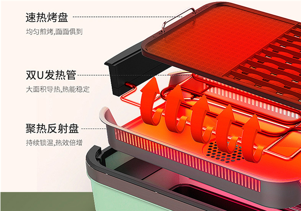 而在温度掌握环节,大宇无烟电烧烤炉SK1组合式的设计,让每一层都实力在线。聚热反射盘,向上补充烤盘的温度,快速稳定加热;搭配上双U发热管,大面积导热,热能稳定;速热鸳鸯烤盘,均匀煎烤,面面俱到。