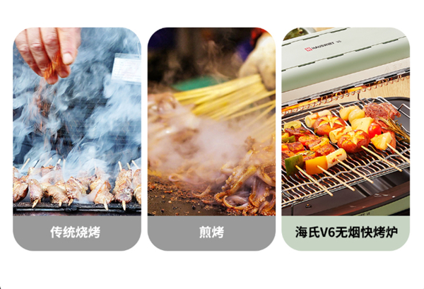 要说烧烤过程中最最最最最让人头疼的是什么?那必然是经久不能消散的油烟。烤肉过程中,一边咳嗽一边烧烤不说,烤完之后,更是满身的油烟味,必须得洗头洗澡洗衣服一条龙,才能摆脱。 而海氏V6无烟快烤炉,就非常完美地帮我们解决了油烟的烦恼,烧烤全程无烟。