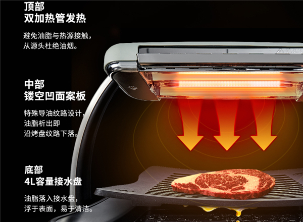 传统烤肉,发热源是在食物的下方,烧烤时,肉类在高温下析出油脂,油脂低落到发热源上,就会发生二次加热,产生油烟,异味呛鼻。