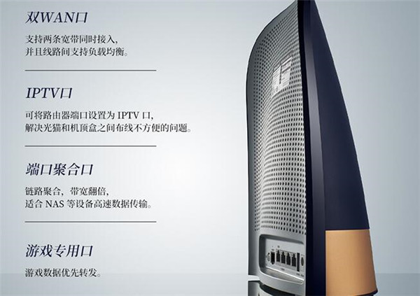 双WAN口/IPTV口/端口聚合口/游戏专用口,用户可以自定义路由器端口功能,满足多样化和更专业的用户需求,灵活方便。