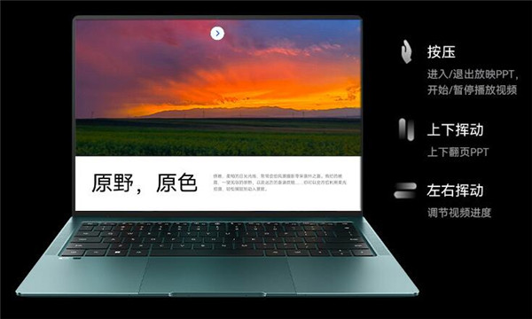 华为笔记本首次支持AI隔空操控手势。当你在会议上起身演讲时,不必弯腰操作,通过上下挥动,就能隔空翻页放映状态下的PPT。同样通过手势按压和左右挥手,还能播放/暂停视频以及调节视频进度,让电脑看你手势“行事”。