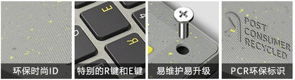 此外,在键盘区还能看到一个小彩蛋,键盘上的E、R两个按键的字符是相反的,并且颜色也有所区分,这可不是加工失误,而是宏碁特别为其加入的设计元素。两个字符对应着Reduce减少、Reuse再利用和Recycle再循环的前缀词根和寓意,不仅再次提倡了环保理念,同时也为产品融入了一种独特的辨识性设计。
