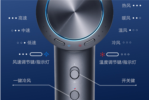 机身上共有四个按键,分别是开关键、一键冷风、风速调节键和温度调节键。这样混合搭配能得到 12 种风温风速组合,满足各种需求。米家高速吹风H900打破单一环形风道,创造性的采用直段+半球设计,更大面积的风道让柔顺的强风与头发接触面积更大。