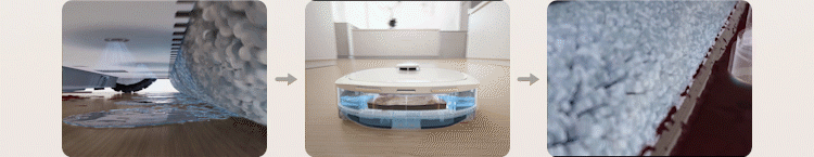 而基站配备的清洁系统由清水、污水桶、拖布清洗装置、风干装置组成。当基站感应到机身清水差不多用尽,污水盒快满时,自动召回机身。首先回收机身上的脏污,然后向拖布喷洒清水并进行高速反转清洗,清洗完成后进行风干,清洁度和风干率高达99%,由此保证了拖布时刻保持干净。