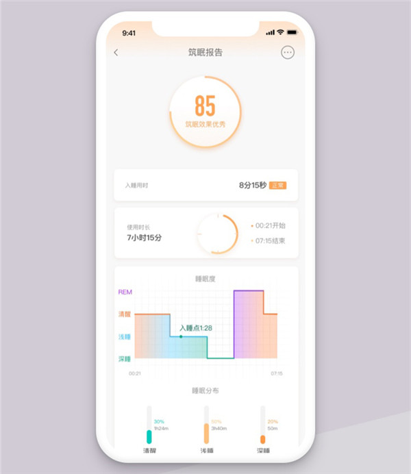 每次睡眠活动结束之后我们都能在筑眠APP上查看本次睡眠的情况,通过详细的图标记录本次睡眠周期的入睡、浅睡、深睡的时间,这些都是通过脑电波模块对人体监测所获得的数据。长期使用会累计每次睡眠的记录,我们就可以明显地看到每次的入睡时间逐渐变短,深睡时间是否增长,从而让我们更加了解自己睡眠质量的变化。