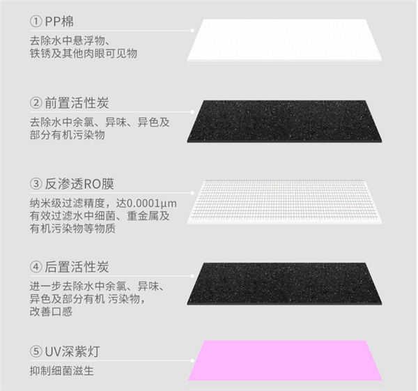 净饮一体机T10净水器部分采用了时下流行的一体式集成滤芯设计,简化更换耗材的流程,仅需每年更换一次滤芯即可。内置过滤系统分为4层,分别是PP棉、前置活性炭复合滤芯、RO反渗透RO膜、后置活性炭净水滤芯。通过层层过滤能够抑制微生物、改善口感,使所生产的净水安全更健康。同时,它与其他RO滤芯不同的是它具有150GPD大通量,接水速度相比市面的同类产品可以提升50%。