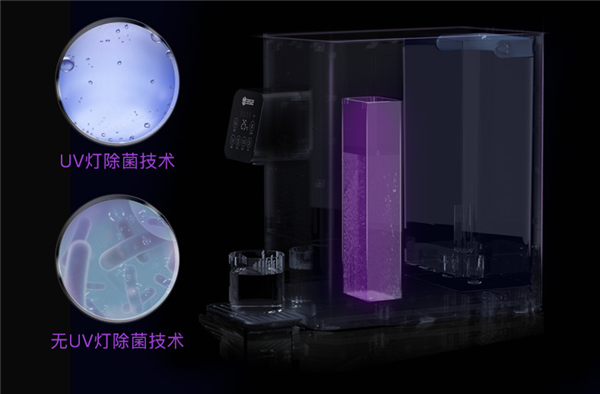 T10在机身内部还有一个隐藏式纯水箱,内置UV深紫灯,可以抑制细菌滋生。也就是说从水箱到水杯的整个净化过滤过程进行了5层过滤杀菌系统,真正做到安心直饮。设备内部采用了一体化的集成水路卡槽设计,接口少,用水更安全,可以有效避免工作中的水渗漏。