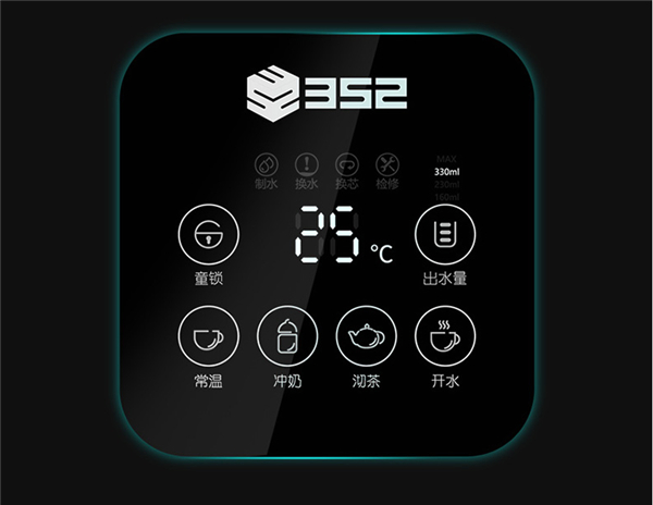温度控制方面,352 T10净饮一体机分别有常温22℃、冲奶50℃、沏茶85℃和开水95℃,四档常用水温预设控制,可以满足不同家庭、办公环境使用。由于是即热式出水,从此也杜绝了反复加热的“千滚水”带来的危害。