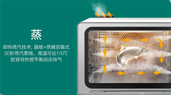 直喷+底部蒸发盘双模式蒸汽共同作用,让蒸汽30秒*充盈腔体,食物快速吸收热量,浸润其中,弹嫩不发干;过温蒸可达110℃,硬壳海鲜、大块食物蒸透不夹生;腔背导热换气不易窜味。