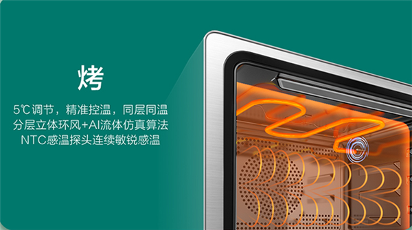 采用NTC感温探头,不断敏锐收集温度信息,智能芯片+Al流体仿真温场模拟算法,时刻保持温度稳定与均匀性,5℃调节搭配分层立体环风风道,一切皆为热量充足稳定,口感百变皆宜。