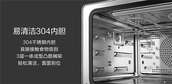 内胆:用的是食品级不锈钢为蒸烤箱同时要经受高温高压和高湿,如果用市面上常见的搪瓷内胆,因为基材是冷轧钢,在大蒸汽的高湿高热环境下,容易生锈,进而爆瓷,而不锈钢内胆易清洁且不宜吸收异味。