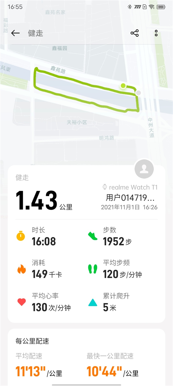 在“欢太健康”App也可以查看运动记录。和手表端略有不同的是,App上会额外显示由GPS定位记录的运动轨迹。