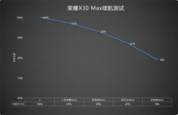 测试过程中,半小时游戏仅耗电3%,看剧半小时耗电5%,刷抖音耗电5%,录视频半小时耗电8%,最后剩余电量79%。当前市面上,荣耀X30 Max的续航也是非常能打的。根据官方数据显示,它可以达成13小时视频播放,8小时以上在线游戏。如果有长途飞行的行程,荣耀X30 Max在飞行模式下,可以播放31小时视频,不额外充电也足够你达到目的地。