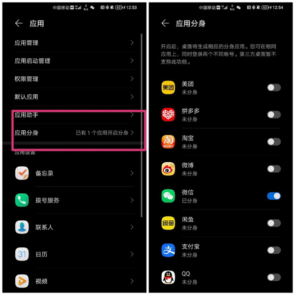 比较有意思的是,Magic UI5.0系统上的应用分身,已经由原本仅支持两个应用,现在已经不断扩展到8个应用或更多,常见的微博,淘宝和闲鱼等等都已支持分身,方便电商用户使用操作。