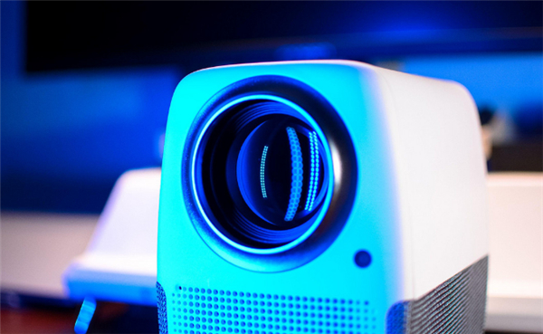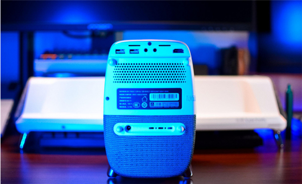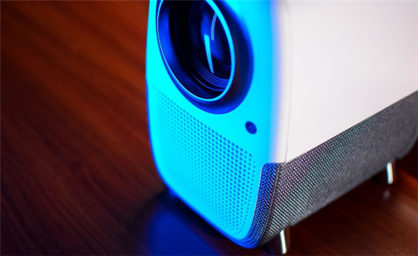 侧面来看,布艺的设计给投影仪增加了高端感觉。而且,布艺的位置是灰色的网格设计,精致感倍增。