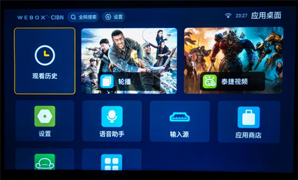 来看一下,主UI。界面清晰易懂,0广告。这里再说一下,5秒开机,反应速度极快,没有任何的拖延、观看广告、购物,非常清爽的UI。这就是我非常熟悉的泰捷WEBOX系统,就是这么简单易用。
