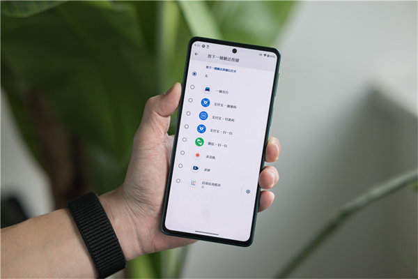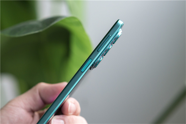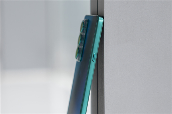 机身的左侧边框有一个一键触达按钮,可以直接开启App或者调出健康码等功能,避免了繁琐的步骤,能够节约我们日常不少的时间,非常实用。右侧是电量按键和电源键,电源键集成了指纹解锁的功能,不过电源按键的位置有些偏上,日常使用的时候不是很方便。