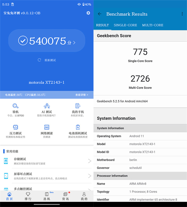 先上跑分,安兔兔测试跑分超54万,GeekBench 5测试其单核得分为775,总分为2726分。这样的理论性能表现其实已经足够应付日常使用还有绝大部分大型游戏。