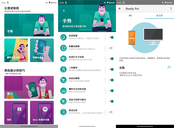 摩托罗拉edge轻奢版运行基于安卓11的MyUI系统,整体的动画风格都更偏向于原生的安卓。当然,这个系统也有很多的moto特色,比如通过简单的手势控制手机,比如游戏模式、AI会议模式、虚拟内存,还有更适合办公人群的Ready For 2.0无线模式,通过Miracast无线投屏到显示器,以及支持有线与扫码连接到笔记本电脑等功能。