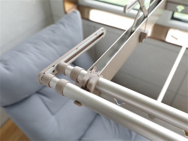 在不需要晾被杆时,还可以将晾被杆收到晾衣杆旁的挂钩处,节省空间。