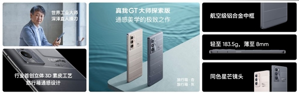 这次真我GT大师系列手机上,设计感是一大亮点,️深泽直人之前为realme/OPPO设计过多款脍炙人口的手机,包括“洋葱、白蒜”、“红砖、水泥”等特别版,这次则是以旅行箱为灵感设计了真我GT大师系列,鼓励年轻人在出行受限的当前继续保持旅行、探索的心态。