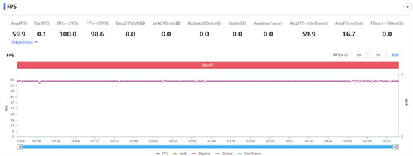 使用HDR高清+极限帧率游玩《和平精英》,平均帧率未59.8 FPS,全程只有轻微的帧率波动而已。