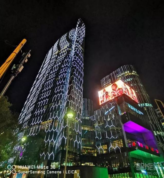 即使上图这种人眼因广告牌刺眼而无法直视的极端情况,华为mate30开启夜景拍摄模式后,无论暗处的彩光还是广告LED屏幕的内容都精确呈现,让细节尽收眼底。