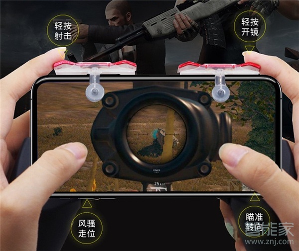 在后面将按键卡扣好是最后一步准备工作,然后就可以四个手指同时操作吃鸡了,左边可以一边移动一边射击,右边可以一边开镜一边瞄准。只要按下红色的按钮就可以了,这款钛度吃鸡神器的按键用起来很顺手,按下后有明显的反馈感,无论是声音还是手感都很棒。